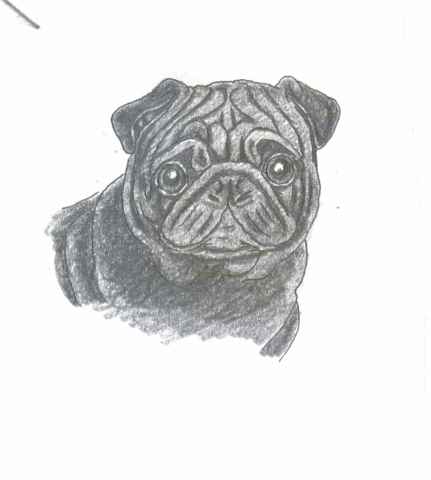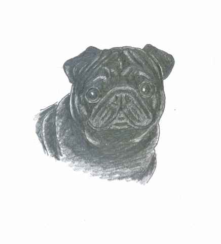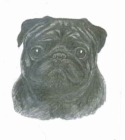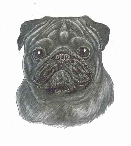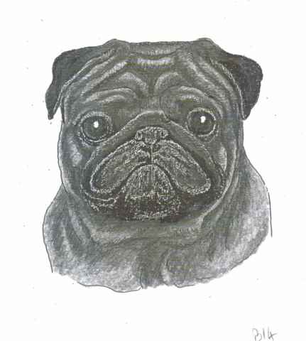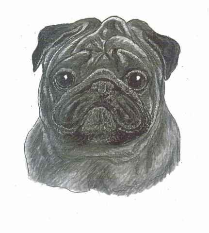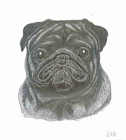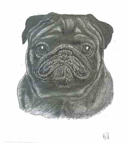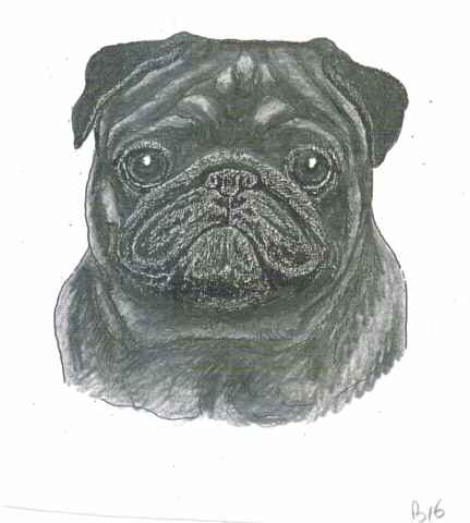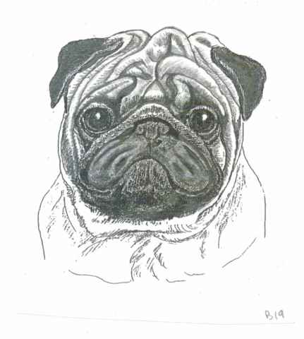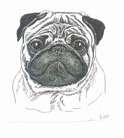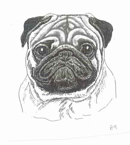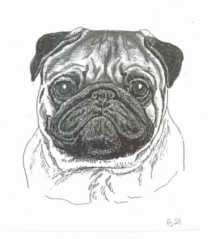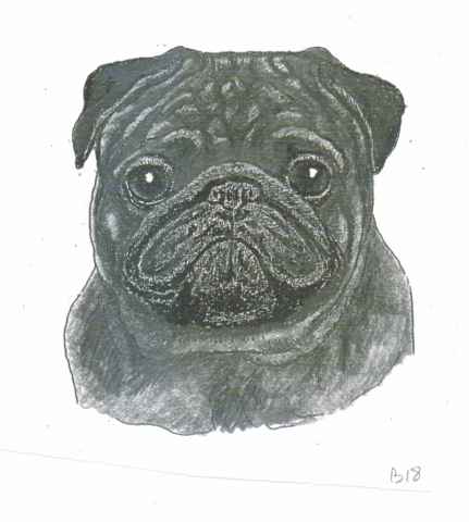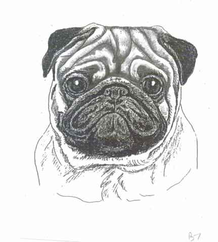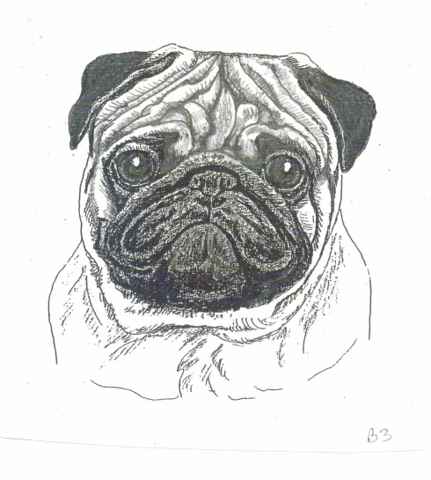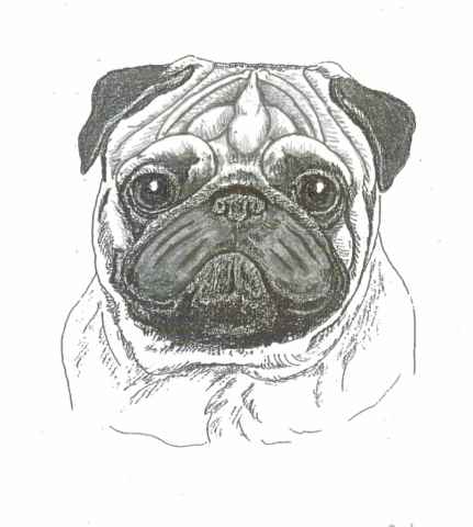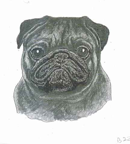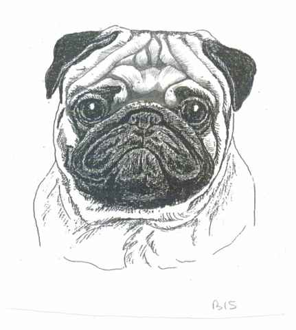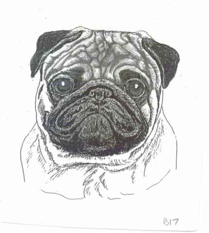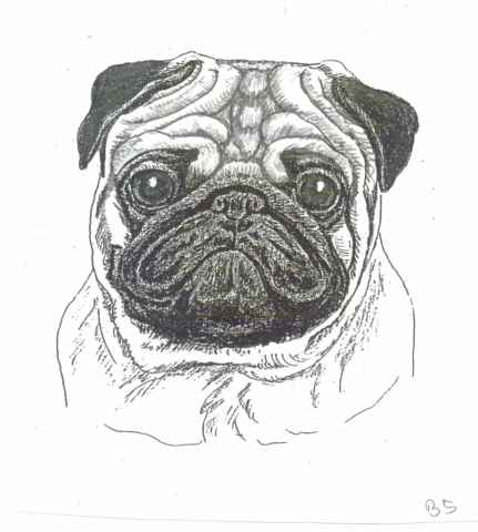 B13/B14 have big wrinkles. B15/B16 have large wrinkles that are also deep. Big wrinkles tend to be rather loose. None of the dogs in this particular sequence have wrinkle that obscure either the eyes or the nostrils but big, loose wrinkle can easily become a health issue, and we have shown a Pug, in the sequence on Balance, where this does occur. We will be including other drawings, in the CISPUG, to illustrate the problems of excessive wrinkle, or wrinkle that is too big. So far, we have shown Fawn Pugs which demonstrate clear contrast between the base fawn colour and the black markings. The last three drawings in this sequence show what are usually referred to as “smutty” Fawns, and which do not show this much desired contrast; rather, the black hairs in the coat mingle with the fawn and in some dogs there are actually solid areas of black to the head. |