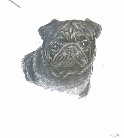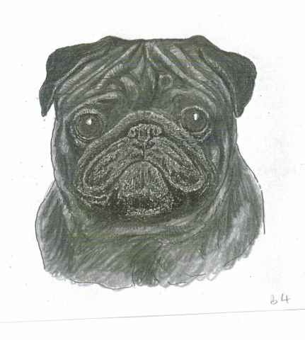 B11/B12 show a dog with slightly odd looking wrinkle, and this is not surprising as it is in fact based on the wrinkle pattern of a Bloodhound head, which is very narrow. You would not often see this pattern of wrinkles on the head of a Pug, therefore, but if you did, it would not be incorrect according to the Breed Standard. Nor, in fact, does it detract appreciably from his expression There is even what might be called a “diamond” marking in the centre of his forehead. |