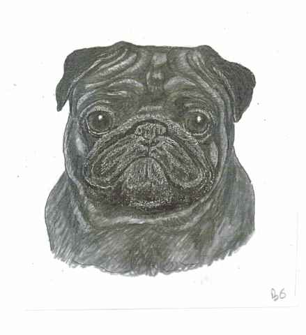 No version of the Breed Standard insists on these markings, nor is it stated exactly where they should be, although common sense suggests that both the “diamond” and the “thumb mark” will be in the centre of the forehead. B7/B8 does not display a “diamond”, by any stretch of the imagination, but he conceivably sports a “thumb mark”. B9/10 shows a distinct midline to the wrinkle, which harmonises well with the head, but you could not say there was either a diamond pattern there, nor a thumb mark. Black Pugs, of course, cannot display either feature, nor the black “mole”. |