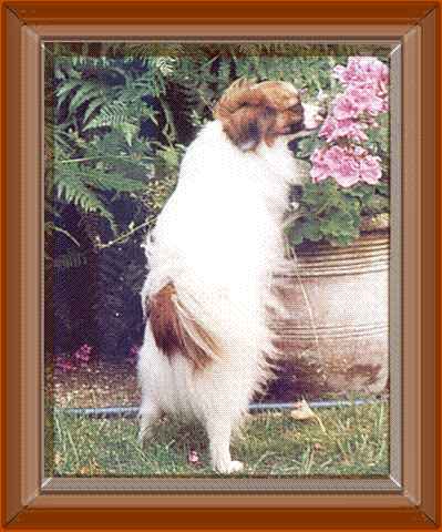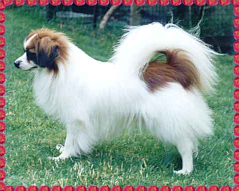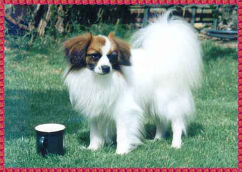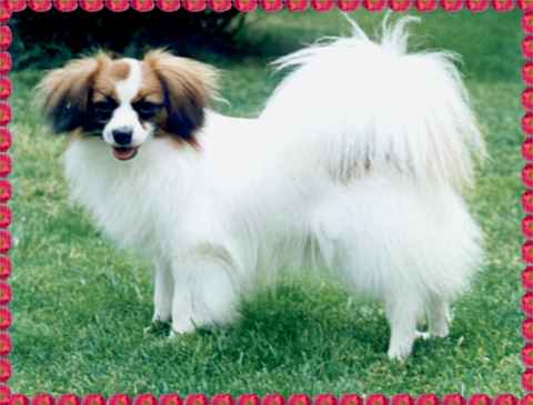 The picture above is taken from the second of our series of Millennium Books, the Millennium Book of the King Charles Spaniel, in which Roland sends best wishes to his 'drop eared cousins'. For some years we nurtured a desire to obtain a Phalene, the more so since we had the privilege of judging the beautiful Ch Gallinas Prince Noir at the Danish Papillon Club Championship show some nine years or so ago. Knowing of our desire our good friend, Deirdre Ashdown kindly bought Roland as a present for us. A medium sized rich red and white with a sparkling white coat Roland is an extremely happy and lively dog with a most outgoing personality. Unfortunately it has not been possible to find him a suitable wife to proceed with a breeding phalenes and he is now living in happy retirement with his friend Gucci (Nouveau Let's Party) |