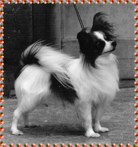 A rich red and white, Squirrel had a successful show career gaining two Reserve CC's as well as a number of BOB's at Open Shows. He was BIS at the Papillon (Butterfly Dog) Club's Diamond Jubilee Northern Open Show in 1983. His litter sister, Nouveau Crown Jewel, was dam of a Aus Ch Nouveau Ringleader, Sw Ch Nouveau Ring Of Jewels and Sw Ch Nouveau Swedish Rhapsody as well as our own dear Nouveau Envoy |