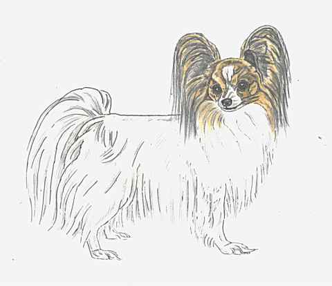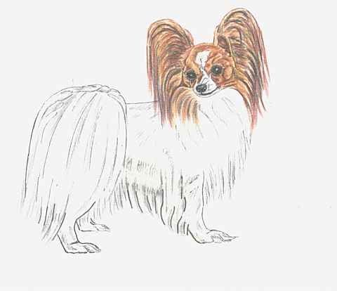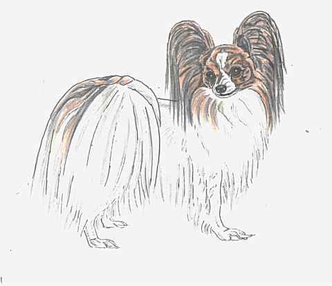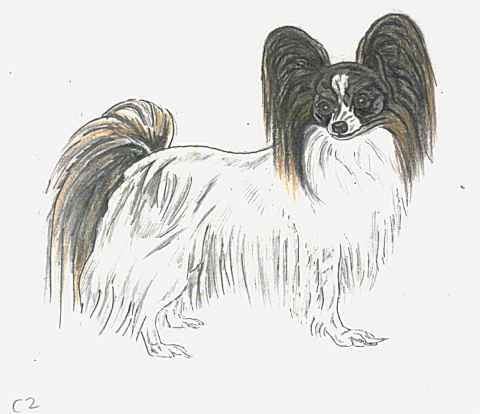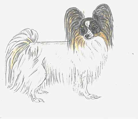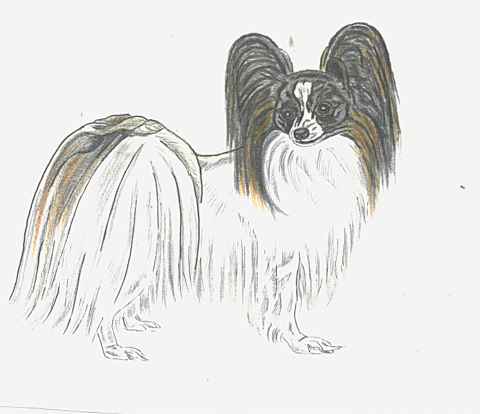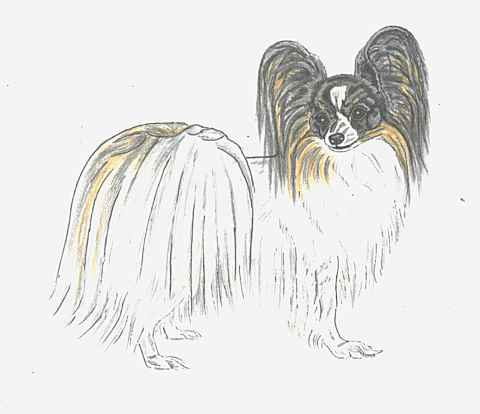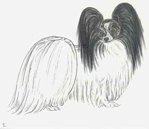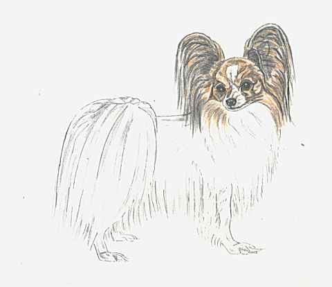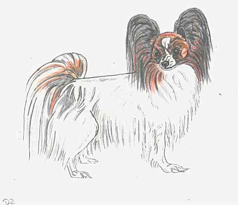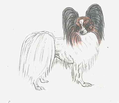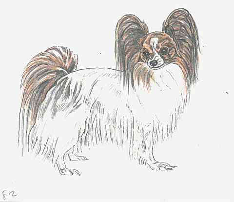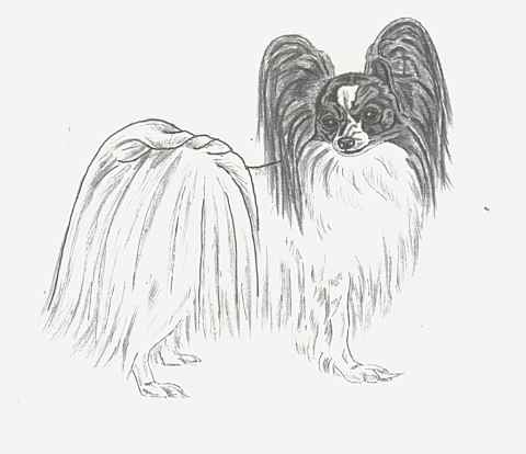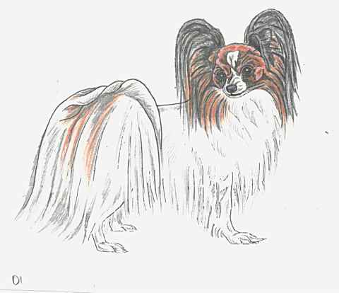 This is a sequence of 15 drawings taken from one template. The original template depicts a beautiful Papillon of classic fine-boned, elegant type, balanced and graceful with a lovely head and fringes. | |||||