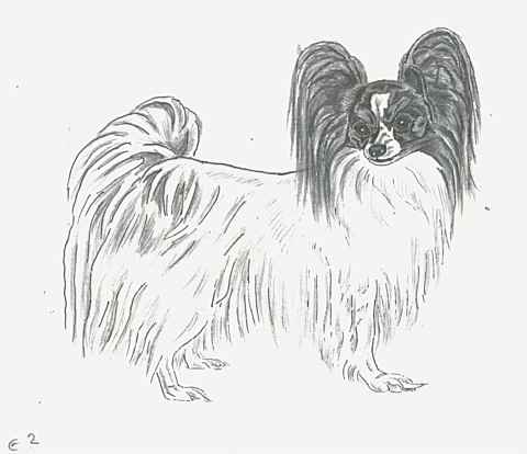 E1 is a very pretty version of this template, showing as it does a black and white Papillon with lovely high plume and good shoulders. Take away the plume and E2 reveals a dog with a rising topline, ( which accounts in part for his tail carriage.) | |||||