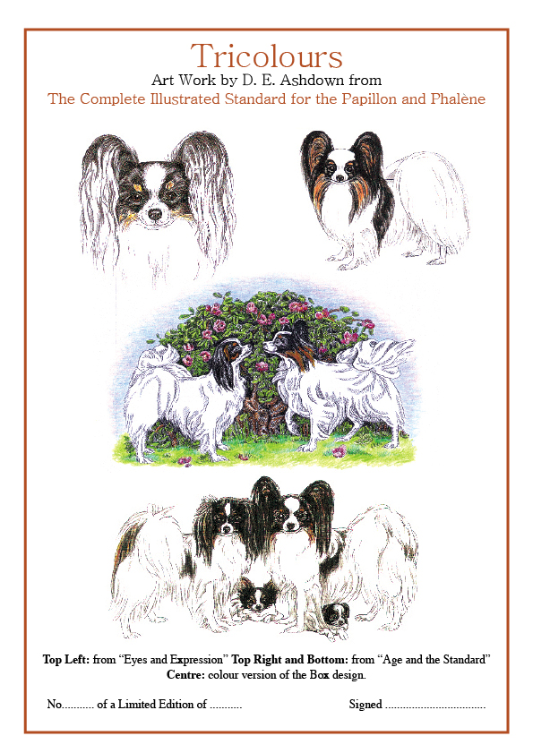 In the top left hand corner of the print is the correct, dark eyed version of a sequence of four from "Eye and Expression", and in the top right hand corner is the fully coated 3 year old version of "Mercury", our imaginary tricolour Papillon from "Age and the Standard".  At the bottom is the header drawing from this section, featuring the "Tricolour Family" - male adult Papillon, female adult Phalene and their two Papillon and Phalene puppies.